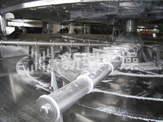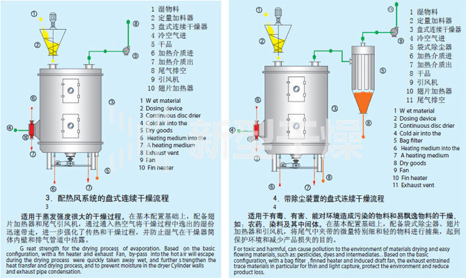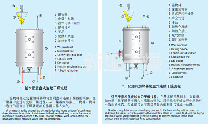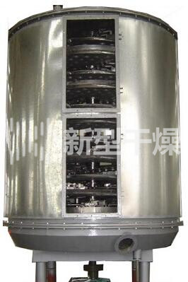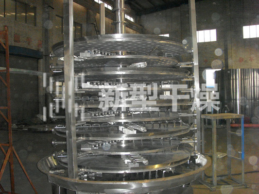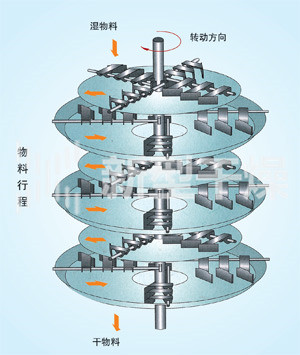 濕物料自加料器連續地加到干燥器上部第一層干燥盤上,帶有耙葉的耙臂作回轉運動使耙臂作回轉運動使耙葉連續地翻抄物料。物料沿指數螺旋線流過干燥盤表面,在小干燥盤上的物料被移送到外緣,并在外緣落到下方的大干燥盤外緣,在大干盤上物料向里移動并從中間落料口落如下一層小干燥盤中。大小干燥盤上下交替排列,物料得以連續地流過整個干燥器。中空的干燥盤內通入加熱介質,加熱介質形式有飽和蒸汽、熱水和導熱油,加熱介質由干燥盤的一端進入,從另一端導出。已干物料從下一層干燥盤落到殼體的底層,然后被耙葉移送到出料口排出。濕份從物料中逸出,由設在頂蓋上的排濕口排出,真空型盤式干燥器的濕氣由設在頂蓋上的真空泵口排出。從底層排出的干物料可直接包裝。通過配加翅片加熱器、溶劑回收冷凝器、袋式除塵器、干料返混機構、引風機等輔機,可提高其干燥的生產能力,干燥膏糊狀和熱敏性物 料,可方便地回收溶劑,并能進行熱解和反應操作。