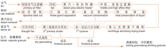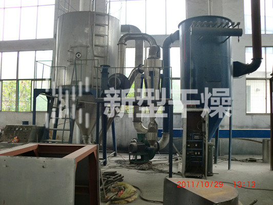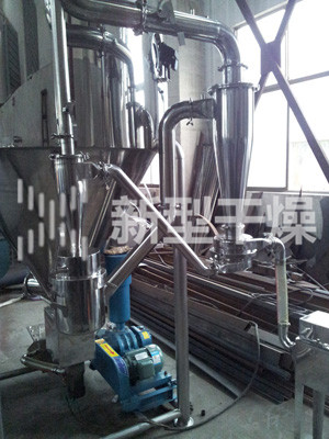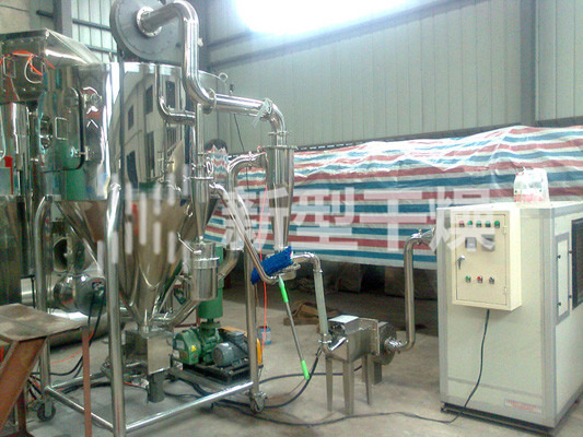 該機采用全封閉形式,所有部件均采用不銹鋼制造,配有三級凈化裝置,過濾后的空氣達十萬級要求。筒體與頂部裝有冷壁裝置,使壁溫<80℃,干燥塔內裝有氣刷掃塔裝置。經該機干燥后的中藥浸膏粉,不會出現焦化變質現象,大大增加了收粉率(95%以上),而且不會產生混藥現象和粘壁現象。
